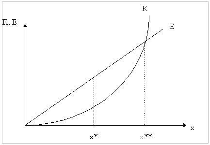 Der Erlös des Unternehmens ist größer als die Kosten, solange weniger als x** produziert wird. Danach würde das Unternehmen Verluste machen.