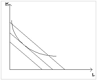 Bei einer substitutionalen Produktionsfunktion ist die Minimalkostenkombination auch von dem Preisen der Produktionsfaktoren abhängig. Die Minimalkostenkombination ist durch die Gleichheit (des absoluten Wertes) der technischen Grenzrate der Substitution (d.h. der Steigung der Isoquante) und dem umgekehrten Faktorpreisverhältnis gekennzeichnet (vgl. Punkt A in der Abbildung)